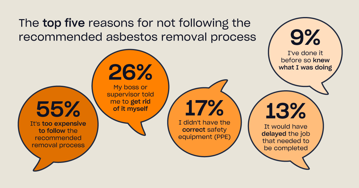 This could be due to many factors, including pressure to meet deadlines and concerns about losing employment. In fact, we found that business owners and supervisors are putting their workers' lives at risk across different industries by telling them to remove asbestos themselves. The biggest culprits are plumbers (46%), joiners (38%), and roofers (34%), and 69% of people surveyed believed there should be stricter penalties for improper removal practices that may endanger workers.
