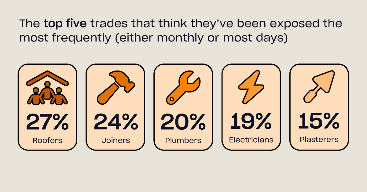 Breaking the findings down by industry, we found that roofers are the tradespeople that believe they are exposed to asbestos most frequently. Concerningly, they are also most likely to ignore asbestos removal guidelines (59%), followed by plasterers (57%) and joiners (38%).